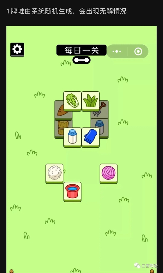而不同于传统消消乐,《羊了个羊》将需要三消的卡牌依某种规则堆叠在一起,玩家需要由上至下的顺序把卡牌一一摆放至下方区域;当三种同样图案的卡牌排在一起时即完成消除。