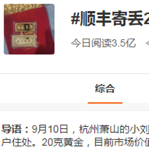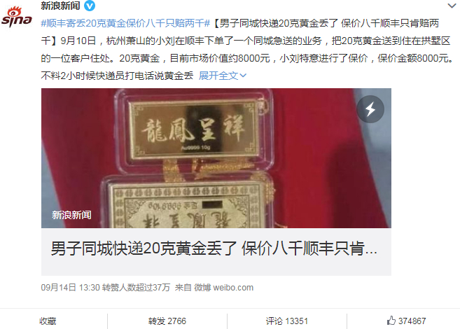 据悉,杭州萧山的小刘在中秋节当天用顺丰下单了一个同城急送的业务,把 20 克黄金送到住在拱墅区的一位客户住处。20 克黄金,目前市场价值约 8000 元,为防止意外,小刘特意进行了保价,保价金额 8000 元,不料 2 小时候快递员打电话说黄金丢了。小刘打电话给顺丰官方客服时,对方表示“的确是快递员丢失了,会有赔付的”,小刘也就暂时放下了心。