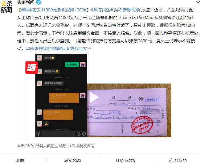 值得注意的是,就在前几日,广东深圳的夏女士花 11000 元买了一部全新未拆封的 iPhone13 Pro Max 从深圳寄给江苏的家人。后面家人迟迟未收到货,向顺丰询问时被告知快件丢了,只能走理赔,根据保价赔偿 1000 元。随后顺丰回应称事情还在核查处理中,责任人员还没核查到。目前能给到的赔付方案是可以赔偿 2500 元,但是夏女士仍表示不能接受。