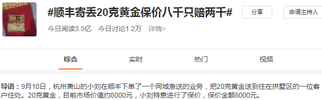 顺丰又一次被推上了风口浪尖。近日,杭州萧山的小刘在顺丰下单了一个同城急送的业务,把 20 克黄金送到住在拱墅区的一位客户住处。小刘特意进行了保价,保价金额 8000 元,不料黄金丢了,顺丰客服工电话表示“愿意赔付 2000 元”,小刘当即表示不接受。。。 相关话题#顺丰寄丢 20 克黄金保价八千只赔两千#冲上微博热搜榜榜一,引发网友们的热议。
