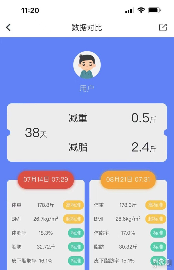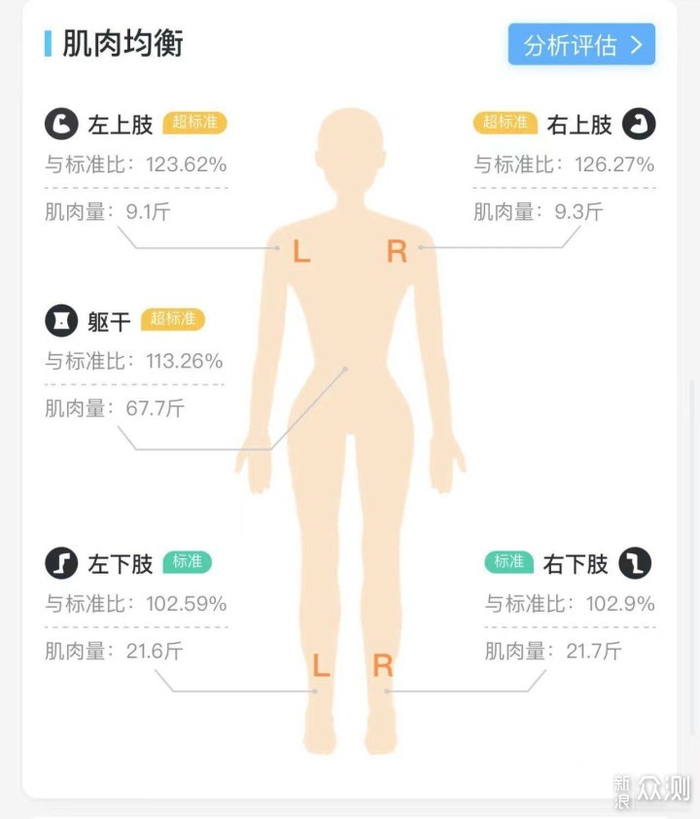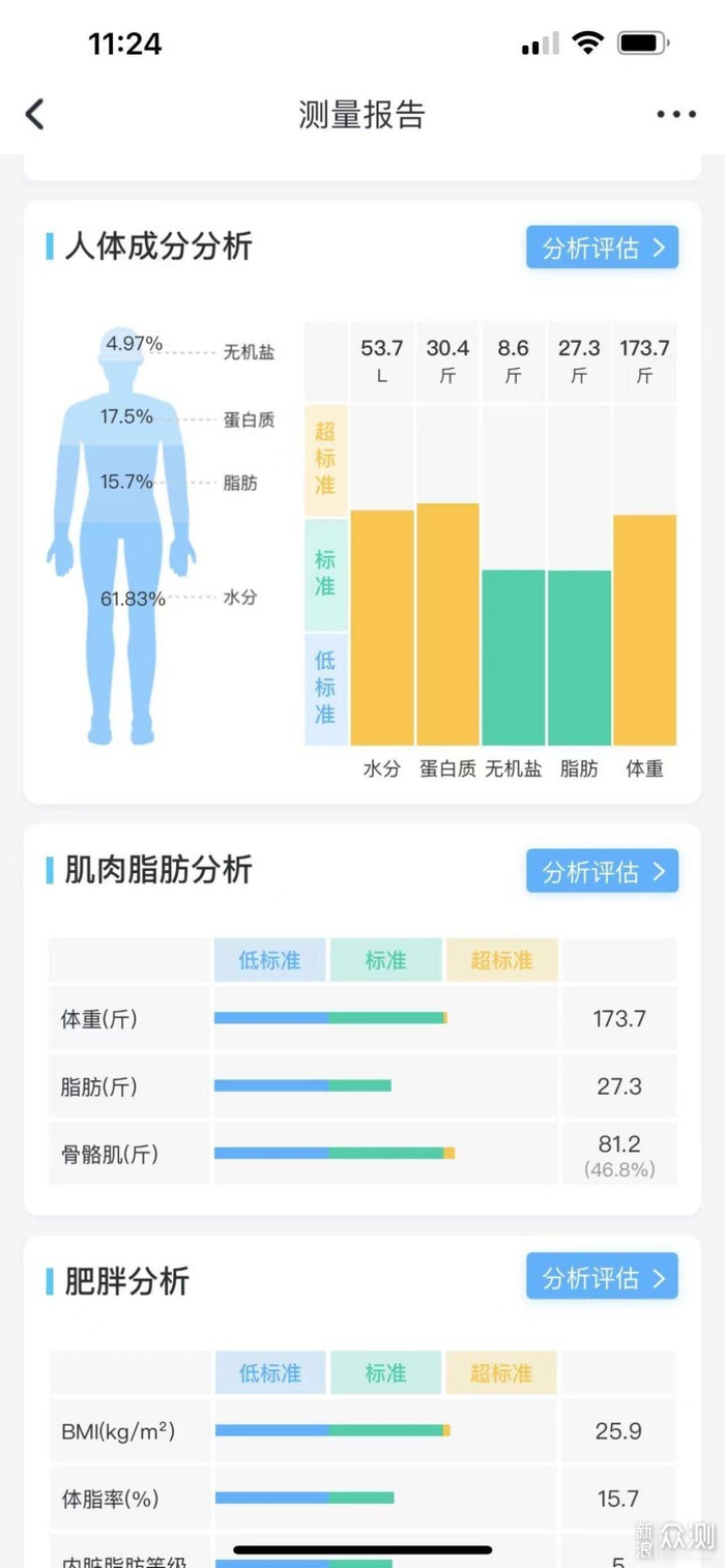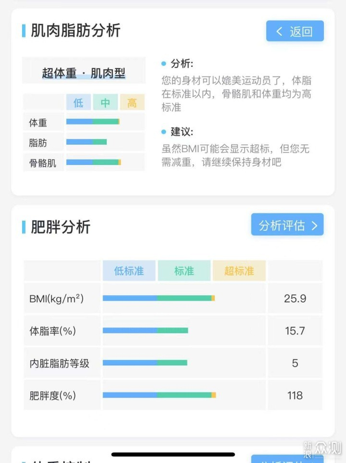 比如我目前虽然体重还超标,但肌肉含量不低,它的测试结果也显示虽然我体重超标,但并不算肥胖,只需要继续保持身材就行了。