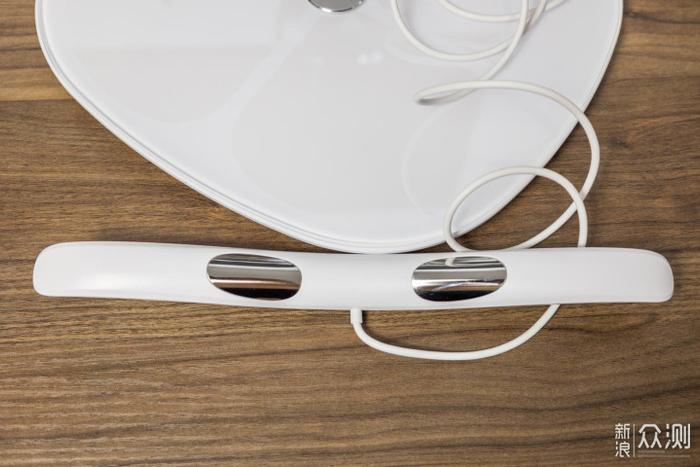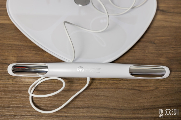 它比普通体脂秤的优势是多了一根长条状的手柄。上面有有正反四个电极,与体脂秤主机上的四电极,一起构成了八电极,可使测量体脂等数据更加准确。