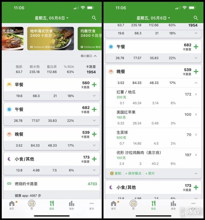 下图是我5月6日时一天总的摄入,以及晚上的摄入详情。