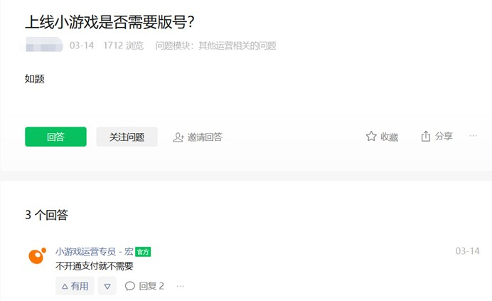 在微信开放社区中,今年3月有人提问“上线小游戏是否需要版号”,小游戏运营专员回复称:“不开通支付就不需要。”