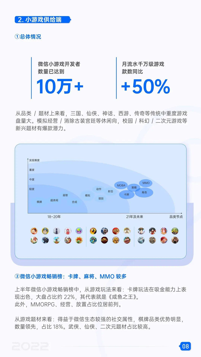 根据《2022微信小游戏增长白皮书》,微信小游戏用户规模数亿级,开发者数量已经达到10万以上,月流水千万级游戏款数同比增长50%。