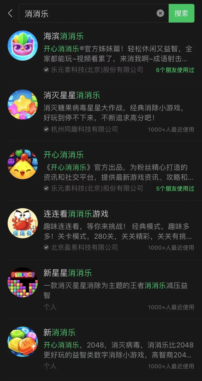 但不可否认的是,目前大量存在于微信小程序中的免费无内购小游戏,并不能在法规当中找到令其“高枕无忧”的依据。在微信小程序中搜索“消消乐”,搜索结果中前10位的小游戏中只有4个是以公司主体发布的,其余6个全部显示为个人主体,均为内置广告的模式。