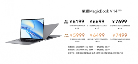 荣耀MagicBook V 14 2022笔记本于2022年9月15日20:00,在荣耀商城、各大授权电商、荣耀体验店、授权零售门店开启全渠道预售,首销优惠价5999元起,正式开售时间为2022年9月22日00:00—9月23日23:59。