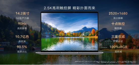荣耀MagicBook V 14 2022还搭载了2.5K高刷触控3:2生产力屏幕,通过国家眼科工程中心护眼认证、莱茵低蓝光护眼认证、以及莱茵无屏闪护眼认证,100%的sRGB高色域和10.7亿色高色深保证画面绚丽逼真,90.5%的超高屏带来沉浸式观感。同时,它也成为Windows平台首款通过帧享超高清认证的商务轻薄本,并联合优酷视频为荣耀笔记本用户打造了专属超高清内容专区。