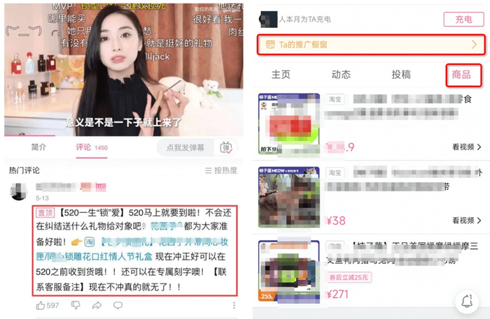 但偏单一的垂直领域的商品,无法支撑资本市场对B站电商的期待,尤其在大步快跑的抖、快电商的对比压力之下。从2018年开始,B站推动up主从基于淘宝联盟的货品池选品,再到商品橱窗、视频、弹幕、评论区等板块中置入商品链接,推动电商交易。