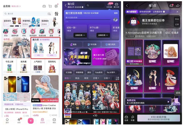 今年年初,B站在会员购中推出了“魔力赏”业务,主打手办盲盒。B站内部对该项目的定位是营收工具,而据新浪科技报道,魔力赏已占到B站电商营收的80%。