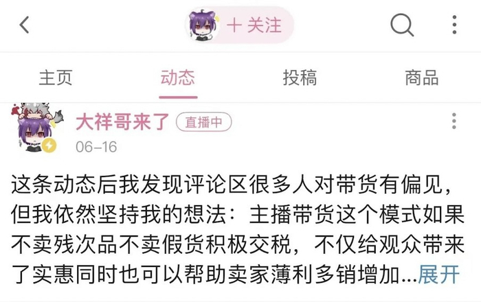 百万粉丝的宠物up主,在B站内已属于头部,但百万规模的销售额并不算高。“大祥哥来了”曾在今年618期间做直播带货,评论区的反馈并不友好,大祥哥本人因此在事后发文回应。
