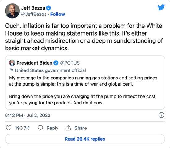 今年5月,拜登在推特上呼吁对巨头企业加税,认为这有助于平抑通货膨胀。而贝索斯则直接回击说,给企业加税和平抑通胀根本就是两回事。今年7月,拜登公开施压石油公司为了公众利益下调汽油价格,认为石油公司追求利润阻止油价下跌,贝索斯又一次毫不留情地指出,拜登又在误导公众,根本没有基本的物价波动常识。