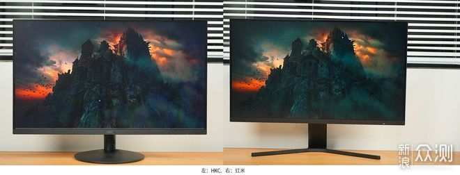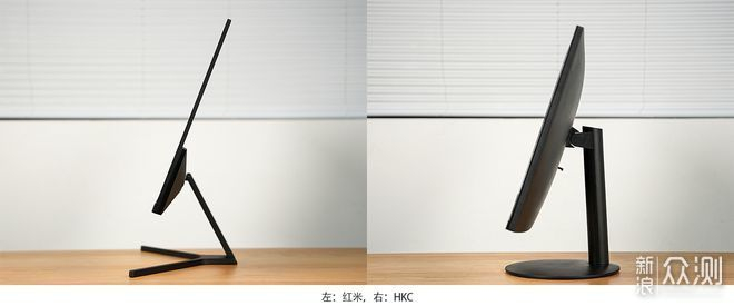 外观上两款显示器都为纯黑设计,环顾一周后能明显感觉到红米这边的外观设计感更在线。两款显示器都有三边窄边框设计,能提升一点使用上的沉浸感。红米显示器的屏幕高度会比HKC稍高一些。