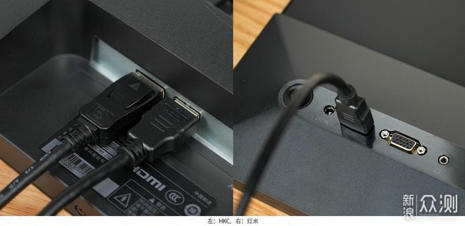 接口位置上,红米是置于背部左侧并垂直,而HKC为底部。如果要说插线的方便程度,红米这边会稍微方便一点,估计很多人都试过接口在底部盲插半天插不上的尴尬情况。而如果考虑线材收纳方面,HKC则会更舒服一点。
