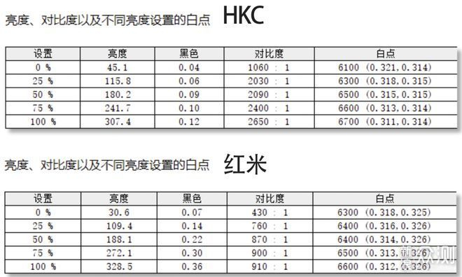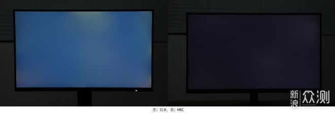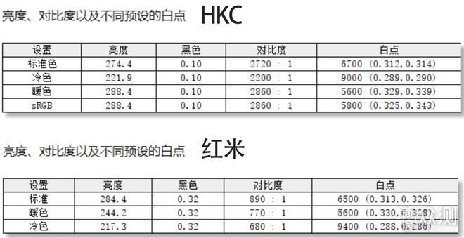默认模式色温下,HKC在6600K~6700K之间,比标准D值高一点,偏冷。红米则为6500K,正好和D值一样,偏暖黄。