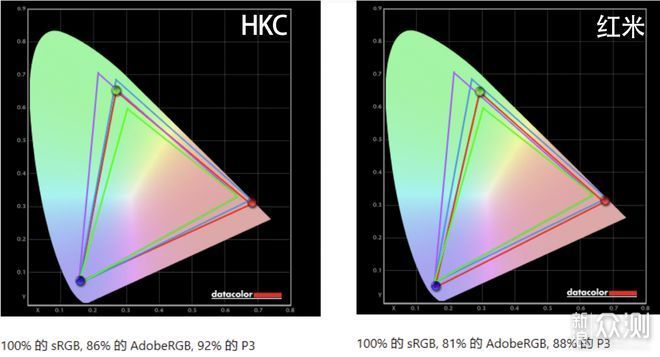色域覆盖的测试结果均符合两款产品的商详描述,HKC测得100%的sRGB与92%的DCI-P3,比商详还好一点,红米测得100%的sRGB与88%的DCI-P3,DCI-P3覆盖范围更广的HKC理论上有更好的观影效果。