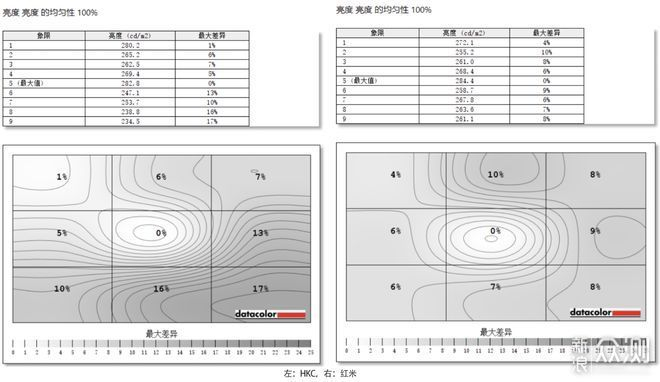 而红米表现则比较好,最大亮度偏差为屏幕上方10%。