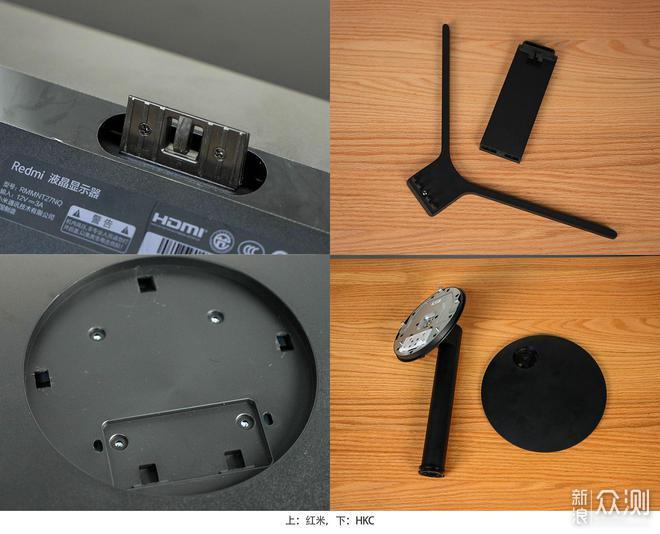 两款显示器都是免工具安装方式,安装起来都没有难度。区别是HKC整机采用了卡扣安装方式,而红米的底座为手拧半牙螺丝固定,个人感觉安装后的牢固度上两者并无太大差别。
