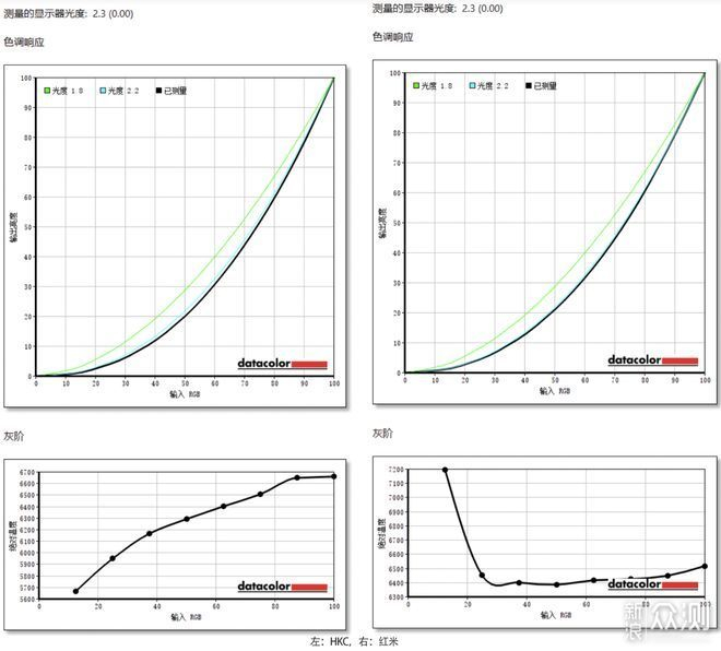 伽马值上,两款显示器都为2.3,比标准值2.2多了一点点,HKC这边会稍微多红米一点,总体问题不大。