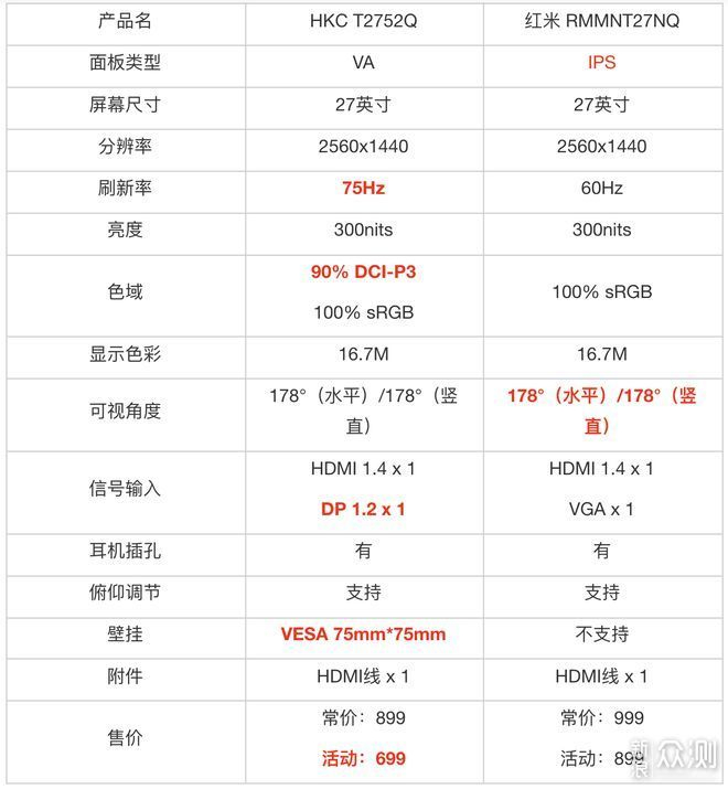 从官标规格来看,HKC T2752Q参数上的优势比红米要好。