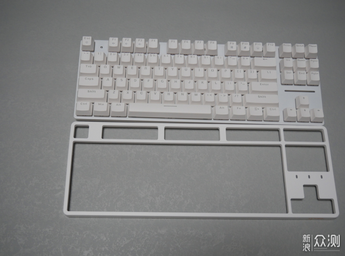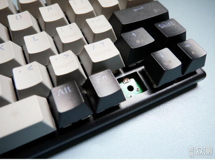 这也是我之前测试过的一把键盘,红龙的同门品牌。采用了悬浮式设计,做工比预想得要好一些,金属定位板和塑料底壳之间的过度顺滑,没有任何割手的感觉。