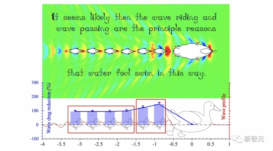 他们发现,小鸭会本能地‘乘风破浪’,跟在妈妈正后方的小鸭可以减少母鸭产生的阻力。它们甚至可以通过‘波浪传递’将减阻传递给其他小鸭。