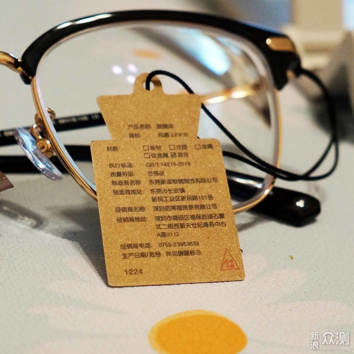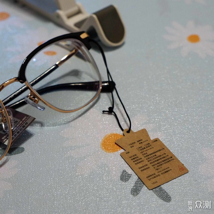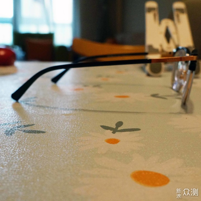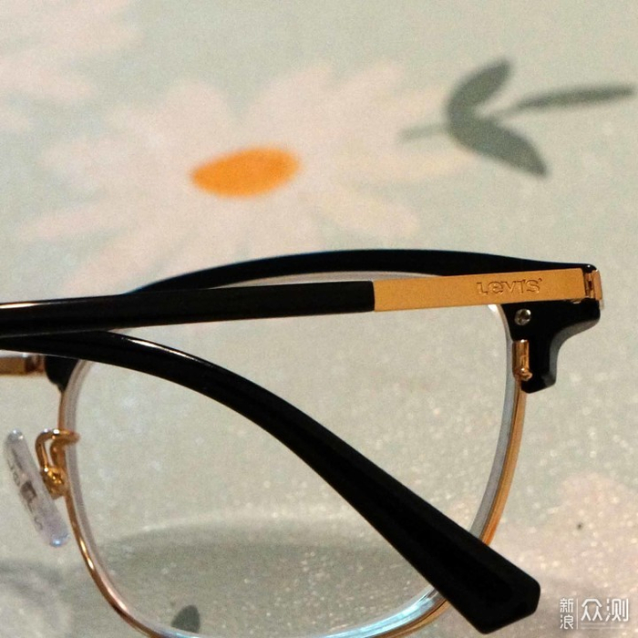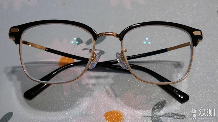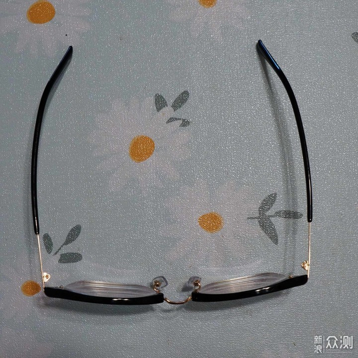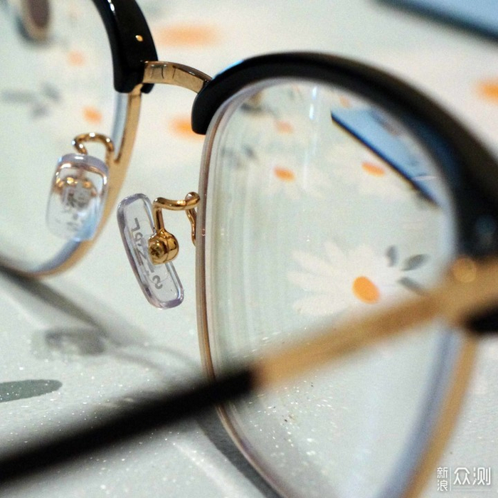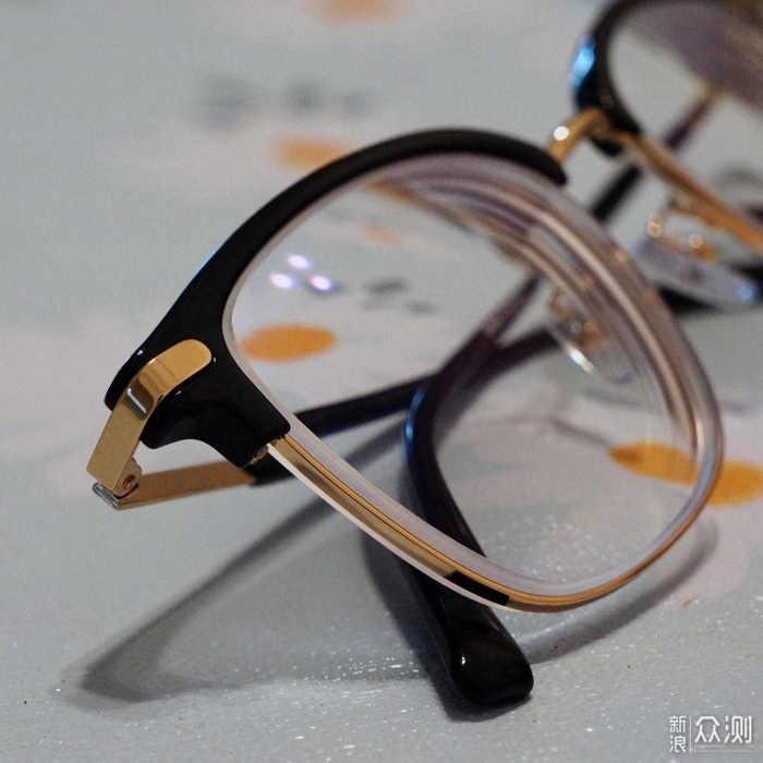 黑色塑胶材质上镜框和金色金属材质下镜框完美过度,没毛刺等。镜腿开合也顺畅,快合拢时有那种卡塔一下的阻尼感,让人忍不住想多把玩几下。