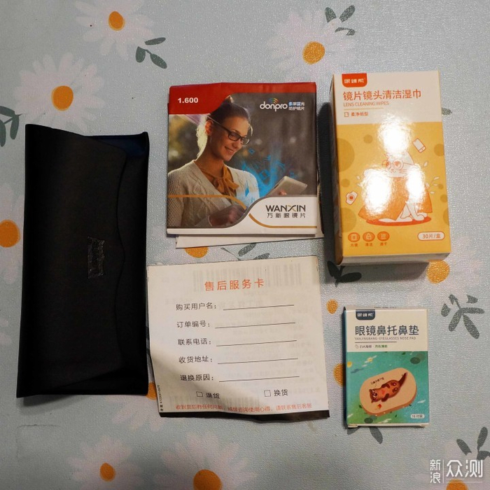盒子里内容物,装有眼镜的镜盒,保卡,镜片包装,以及赠品的镜头纸和鼻托。