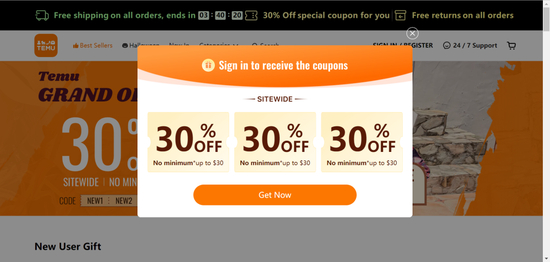 为促进消费者购物,Temu还推出各种各样的优惠政策。目前所有商品皆无门槛免邮费,90天内免费退货,新注册用户将领到3张全品类7折优惠券,且能在“1分钱商品专区”获得一件新用户礼物。