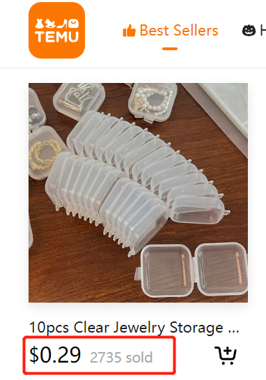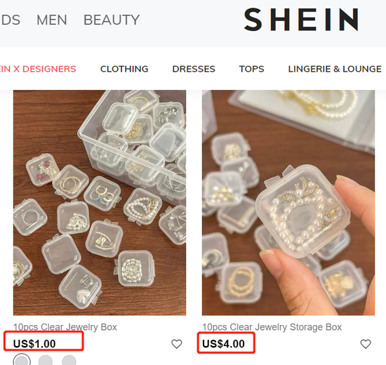 例如,当前在Temu最热卖的一套10个珠宝储存小盒子,售价为0.29美元,而在SHEIN上,同款商品至少售价1美元。此外,大量服饰、家居商品的价格也都维持在10美元之下。