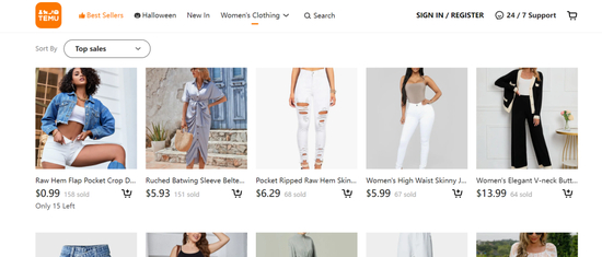 目前,这句似乎暗示“团购”“砍一刀”等玩法的口号尚未真正“实装”。在以橙色系设计为主的Temu网站、App内,下单方式并非“拼团”。但差别已经显现,与以时尚女装起步,逐渐向全品类扩展的SHEIN不同,落地美国的Temu一开始便以男服、女服、美妆等14个类别的全品类模式出场,展示出极低的价格,主动挑起“价格战”。