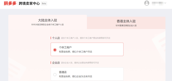 在拼多多跨境卖家中心入驻页面,可以看到拼多多已对大陆注册的个体工商户、普通店(非品牌)以及香港注册的普通店开放入驻。整个申请过程并不复杂,分为填写主体信息、法人/经营者实名认证以及填写店铺经营概况三步,其中经营概况涉及营收规模等具体信息。