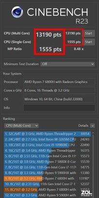 CINEBENCH测试标准中,实测CINEBENCH R15多核2224cb、单核253cb;CINEBENCH R20多核5157cb、单核600cb;CINEBENCH R23多核13190pts、单核1555pts。从评分可以看出,单核多核性能发挥出色,表现抢眼。