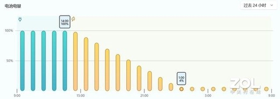 通过系统自带的电池电量监测也可以看到,测试是从下午14点开始,至凌晨1点前进入4%剩余电量保护,满足一天不插电办公需求是没有太大问题的。