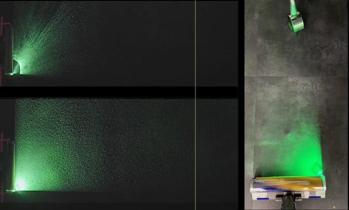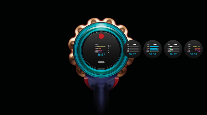 在全新设计的在Fluffy Optic™光学软绒滚筒吸头中,工程师们将光源安装在吸头末端尽可能低的位置,形成一道20°的光束、照射出地面上的微尘;PCB印刷电路板经过精准设计,能保持光源冷却,无需额外的散热器。与此同时,在利用压电式声学传感技术实现实时灰尘分类统计的基础之上,用户交互数显界面也经过全新设计,可以实时动态反馈灰尘数据和地面清洁程度:启动机器时,LCD液晶屏会显示4种尺寸的颗粒物,这些条形图会根据捕获颗粒物的浓度变化,实时伸长或缩短,并为用户的清洁提供指导。
