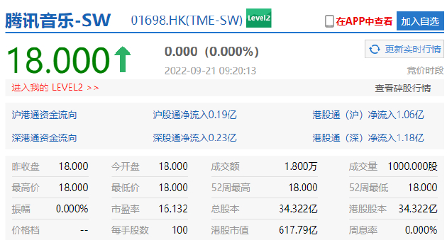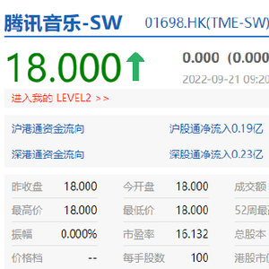 新浪科技讯 9月21日上午消息,今日,腾讯音乐娱乐集团(NYSE:TME)以介绍上市方式正式在港交所挂牌交易,股票代码为“1698”,上市首日开盘报每股18港元,港股市值617.79亿港元。
