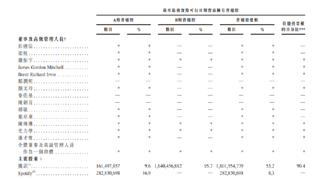招股书显示,腾讯持有腾讯音乐53.2%的股权,并享有90.4%的投票权,是其控股股东;Spotify持股8.3%。