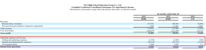 对于这笔收入的大幅增长,第一高中在财报中表示,2021年度,受疫情影响,考虑到政府补助的不确定性,故只将学生实际收到的资金确认为政府合作协议的收入;而2022年上半年,政府合作协议收入增加。