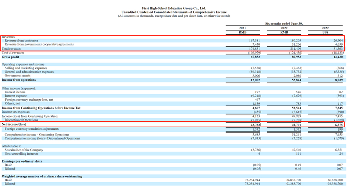 财报中,上半年,第一高中教育的学生人数也出现明显增长,截至2022年9月8日,第一高中教育提供管理服务的学校项目和公立学校的注册学生总数为29718人,比去年同期增长34.7%。同时,公司有14个高中项目、5个高考复读项目和5个学校管理服务项目,公司正进一步扩大到职业学校项目的合作。