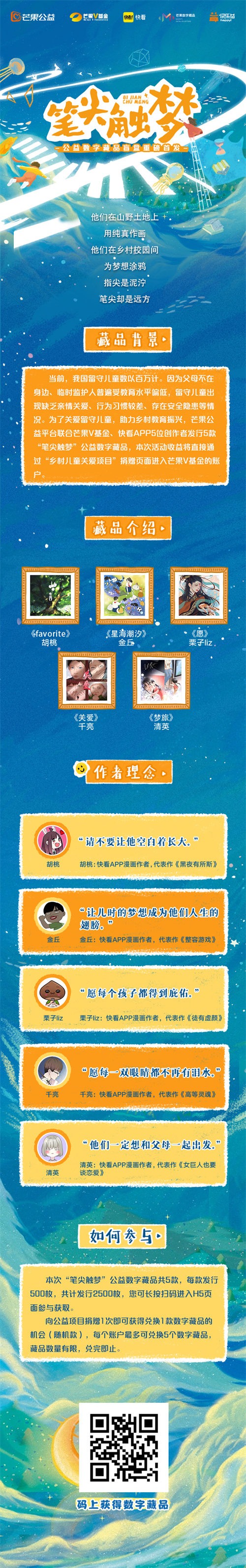 以乡村留守儿童为题材,快看平台的5位新生代漫画创作者绘制了五幅作品,并由芒果公益联合芒果数字藏品制作成公益数字藏品,五款数字藏品分别发行500枚,爱心人士每完成一次最低9.9元的捐赠,便可兑换其中一款。