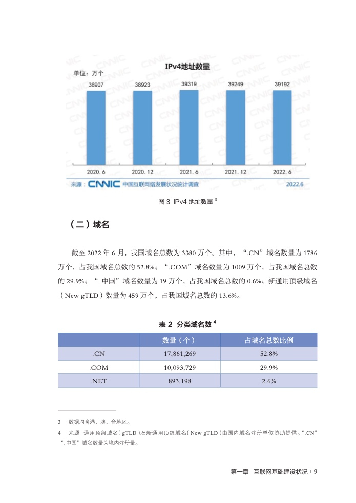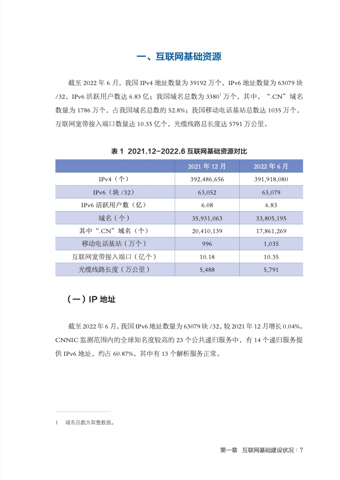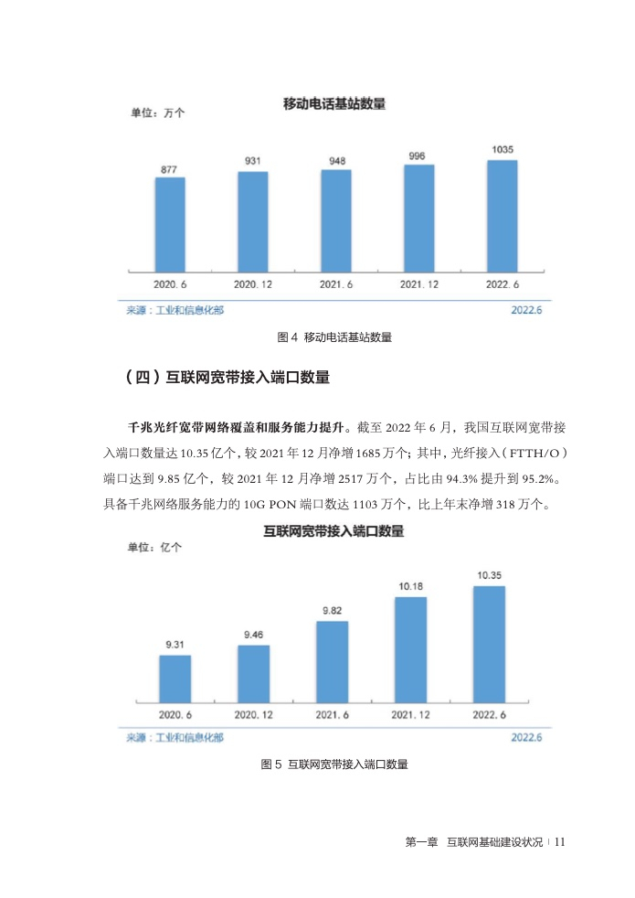 《报告》显示,在网络基础资源方面,截至2022年6月,我国域名总数为3380万个,“.CN”域名数为1786万个,IPv6地址数量为63079块/32,较2021年12月增长0.04%。在信息基础设施建设方面,截至2022年6月,我国千兆光网具备覆盖超过4亿户家庭的能力,已累计建成开通5G基站185.4万个,实现“县县通5G、村村通宽带”。三家基础电信企业的固定互联网宽带接入用户总数达5.63亿户,比上年末净增2705万户;其中100Mbps及以上接入速率的固定互联网宽带接入用户达5.27亿户,占总用户数的93.7%。三家基础电信企业发展蜂窝物联网终端用户16.39亿户。