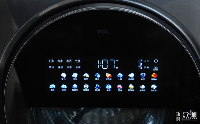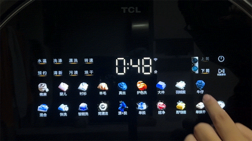 下筒的程序最全,从左到右排满,值得关注的功能有大件洗、冲锋衣、单烘干以及空气洗等。不用再像过去的洗衣机,自己判断什么材质的衣物,需要什么清洁力度,选哪一类清洁程序,得多大力度甩干了。一键启动,直观又省事。
