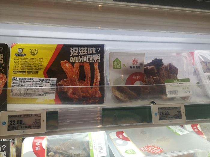 蓝鲸财经记者在北京盒马首店看到,熟食区摆放的卤制品品牌只有紫燕和周黑鸭。