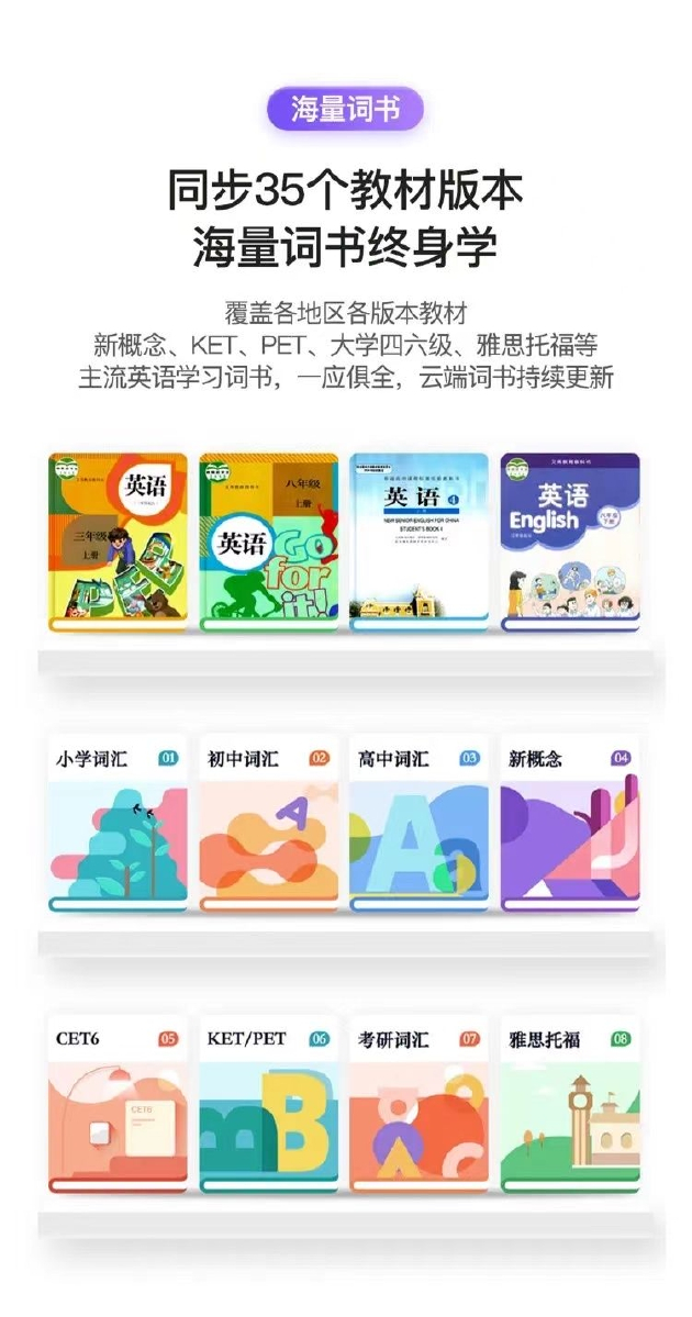 在内容资源方面,如布AI双语单词卡K11内涵全国各地区版本教材、新概念、KET、PET、大学四六级、雅思托福等主流英语学习词书,共35个版本的教材,一应俱全。同时,通过如布单词卡APP,用户还可以将海量云端词汇库同步到自己的 AI双语单词卡上,而且如布K11支持定制属于自己的单词书,帮助学生群体更高效地定制学习方案,轻松实现个性化学习。学习时点击进入词条,就可以看到单词的读音、释义和例句。每个单词释义精准丰富,搭配短语和例句,同时还有近义词,同步扩充学习者的词汇量。