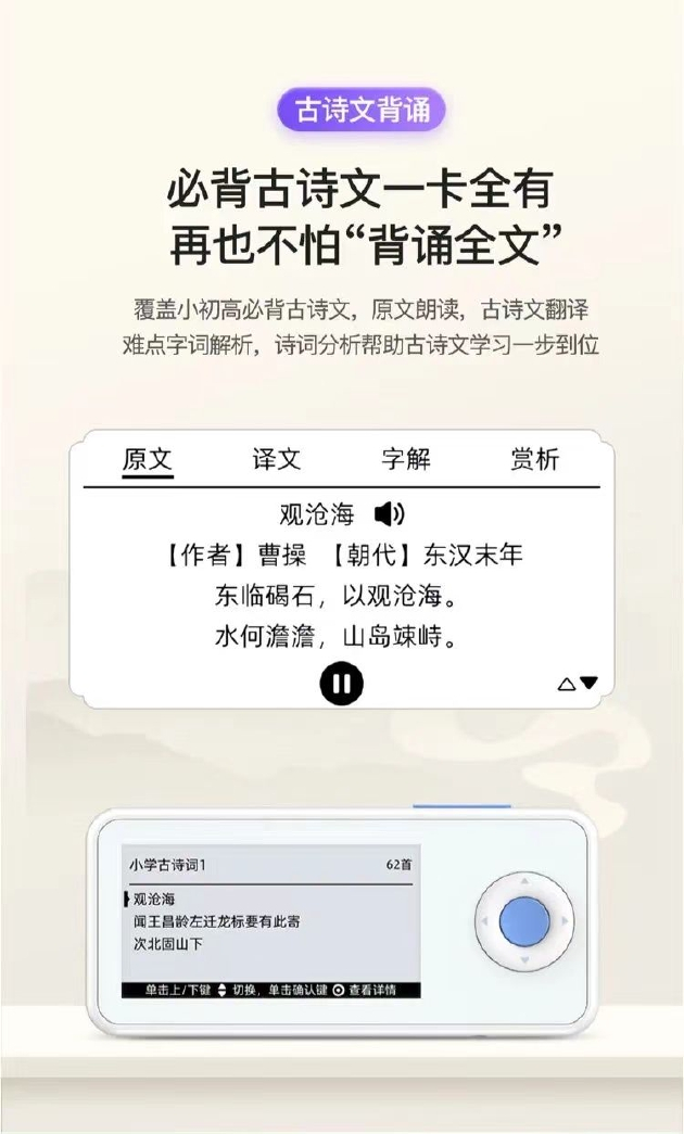 此外,如布 AI双语单词卡K11还符合当下“大语文”学习潮流。一张单词卡中涵盖了小、初、高必备古诗词,同时功能上还支持古诗文的原文朗读,可将复杂的古诗文进行白话翻译讲解给学生,及诗词赏析,帮助学生群体更好的理解古诗文。