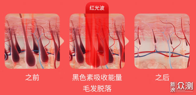 毛囊是黑色的,皮肤是白色的,我们可以想象成是两个气球,黑色的气球是我们的毛囊,白色的气球就是我们的皮肤。只有在这个特定波长范围内的光,打过去黑色气球会破,但是白色气球不会,这样才能尽量的不损伤我们的皮肤又能达到抑制毛发生长的作用。