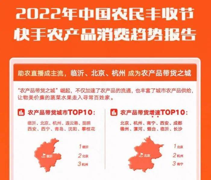 短视频平台快手于近期发布了《2022年中国农民丰收节快手农产品消费趋势报告》(以下简称《报告》),其中临沂、北京、杭州成为“农产品带货之城”,芒果、橘子、榴莲跃居“新国民水果”,种子种苗销量走俏等农产品新消费趋势引发关注。