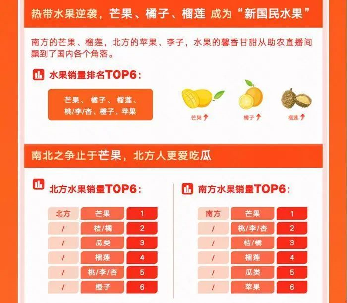 除芒果这一共同喜好外,南北方对其他水果的喜爱则有所不同,北方人普遍偏爱桔类、瓜类、榴莲等南方水果,而南方对桃李杏等北方特有水果钟爱有加,背后体现的是人们对多元农产品的包容与喜爱。