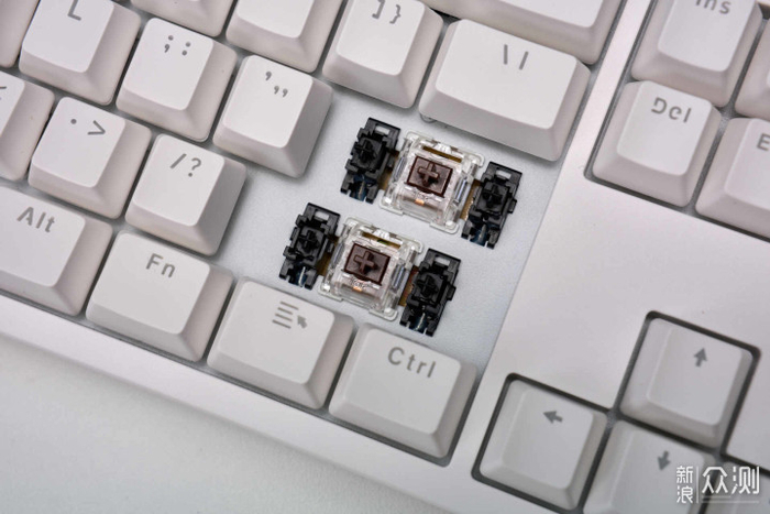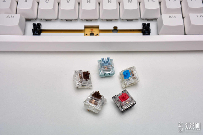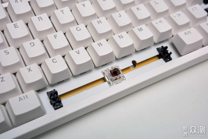 ▲FE104幻彩版的轴体,有红轴、茶轴、青轴可选,都是艾石头自家的V3轴体。我体验的这款是茶轴的,轴体杂音较少,手感算是不错。cherry轴的神话早就不再,国产轴体的素质已经崛起了。另外,虽然售价很低,但它还是使用了卫星轴的设计,可以保证大键的优秀的按压手感。