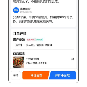 在用户点1份餐要10份餐具被拒绝给差评后,该商家发起了差评申诉,平台单方较难判定,推送给“小美陪审团”进行评审,最终评审员的投票结果认为用户评价不合理,商家的差评投诉获得通过。